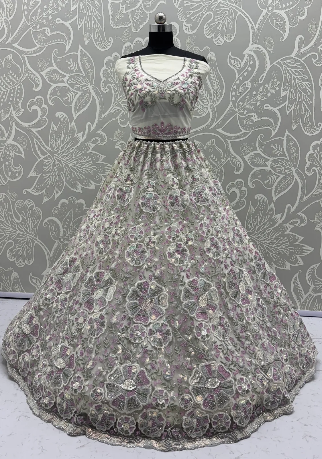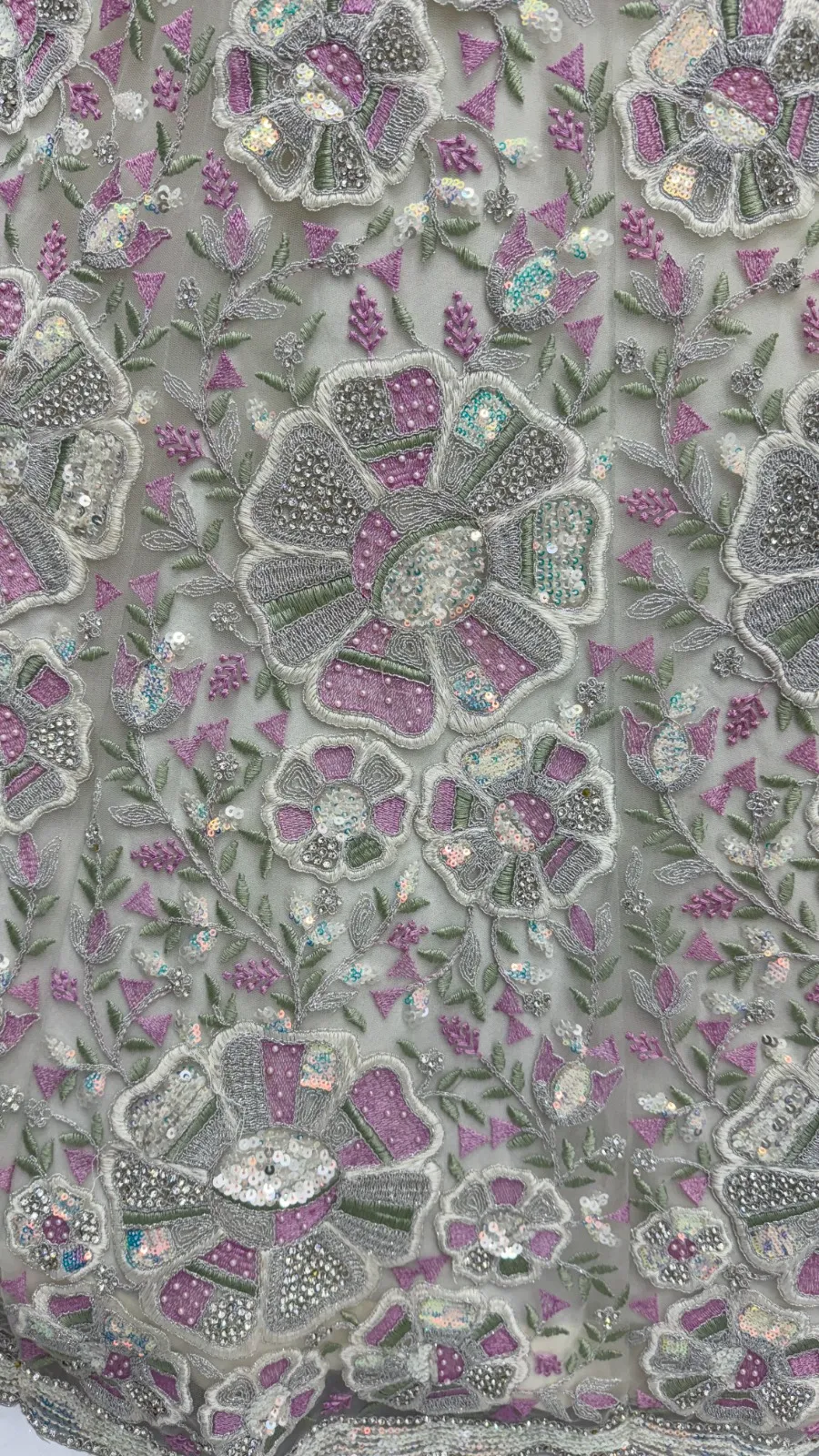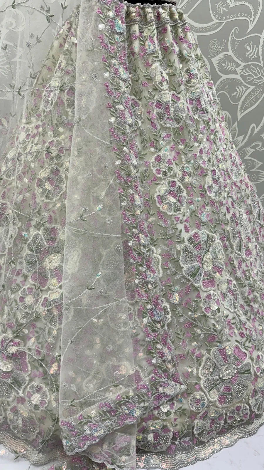 | Lehenga | Net Flower Embroidery Pattern, Multi Thread work, Dori Embroidery, Sequence and Zircon Diamond studded |