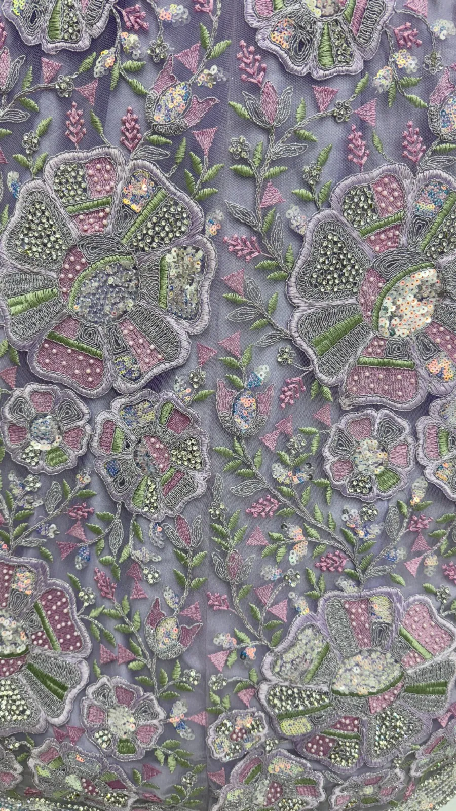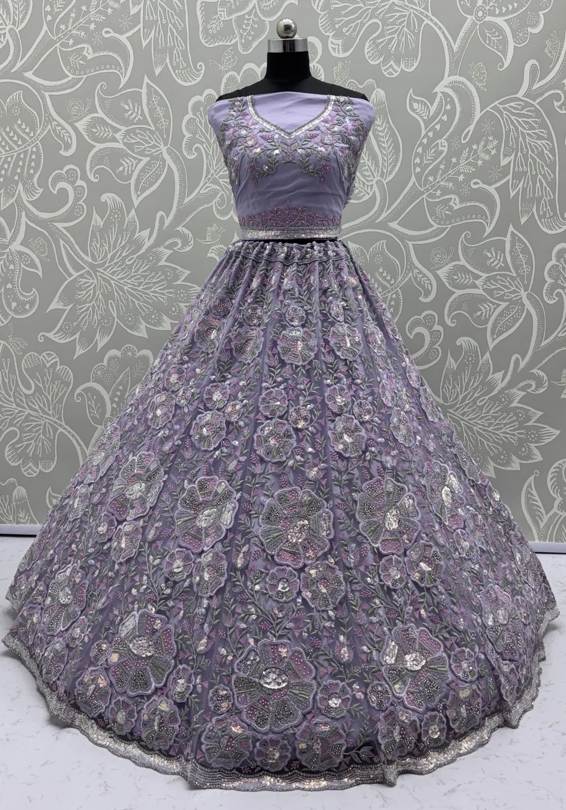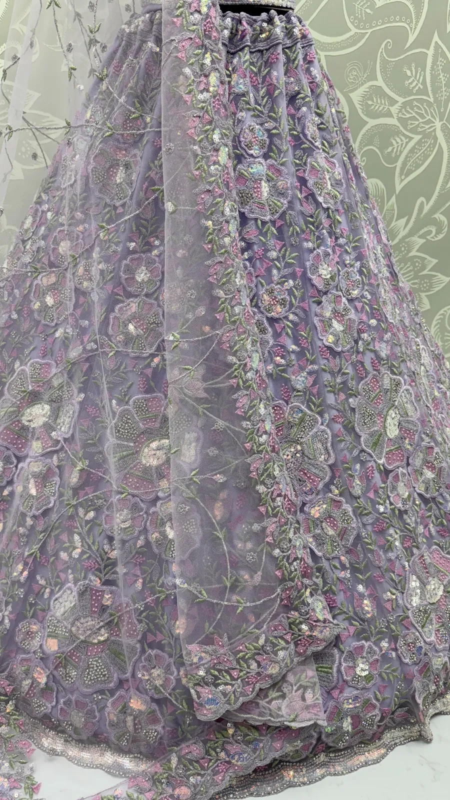 | Lehenga | Net Flower Embroidery Pattern, Multi Thread work, Dori Embroidery, Sequence and Zircon Diamond studded |