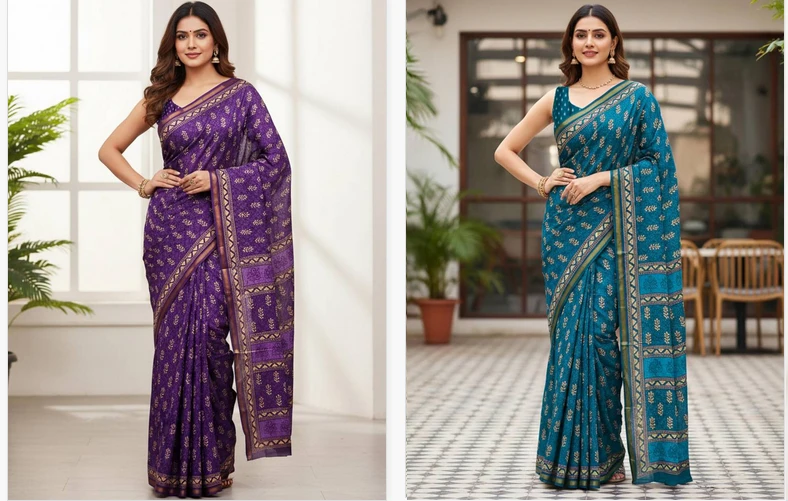 | Fabric | Model Cotton Saree Crafted Natural Colored Bagru Block Prints Woven Zari Border |