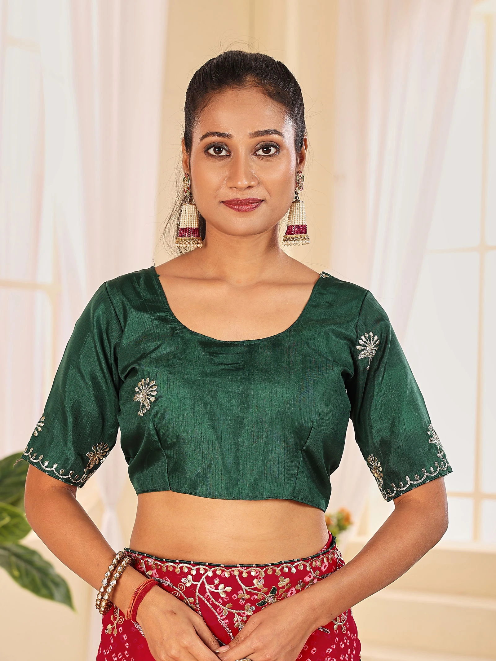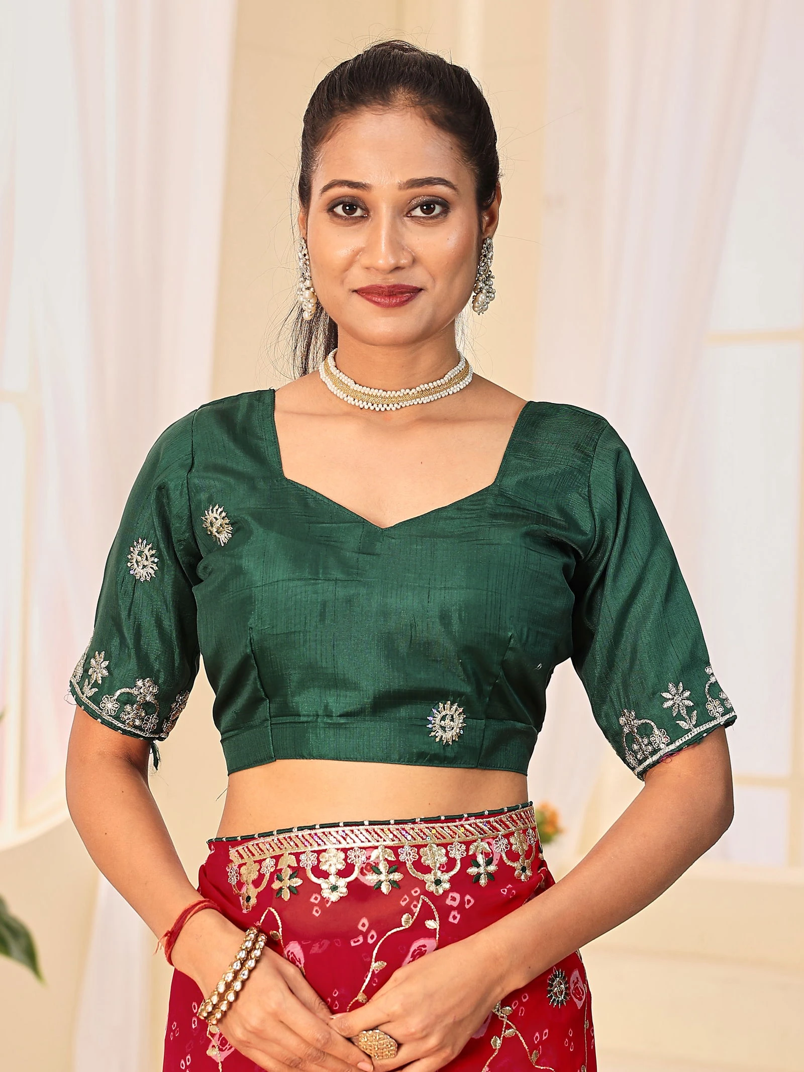 | Work | Fancy Red Rani Colours Bandhani with Gota Embroidery |