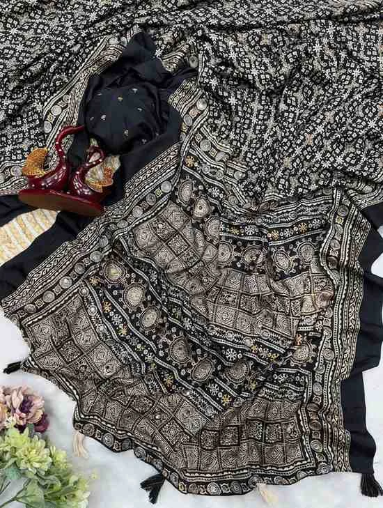 | Saree | Soft Crepe Silk with Ajarakh Print with Zari and Real Mirror Work |