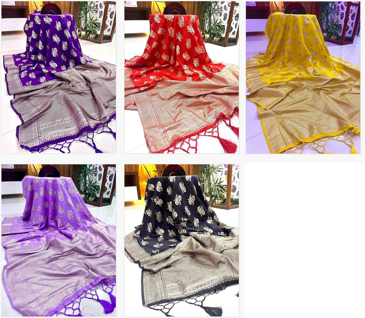 | Fabric | Pure Soft Khadi Crepe Silk Saree with Rich Antique Zari Wooven Rich Pallu with Tassels N Zari Wooven Border with Meenakari N Zari Wooven Gulab Buttas |