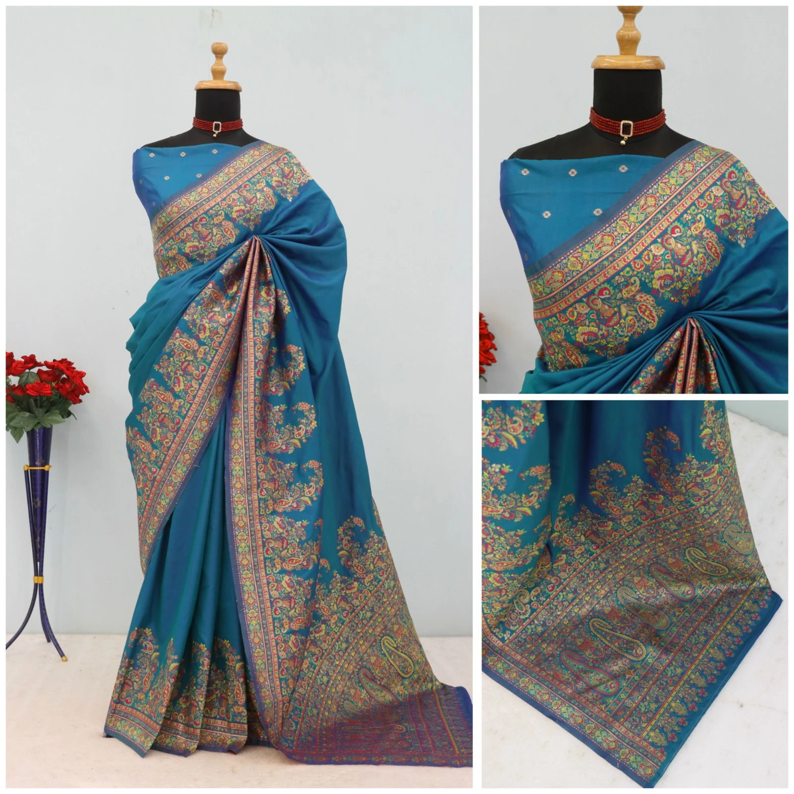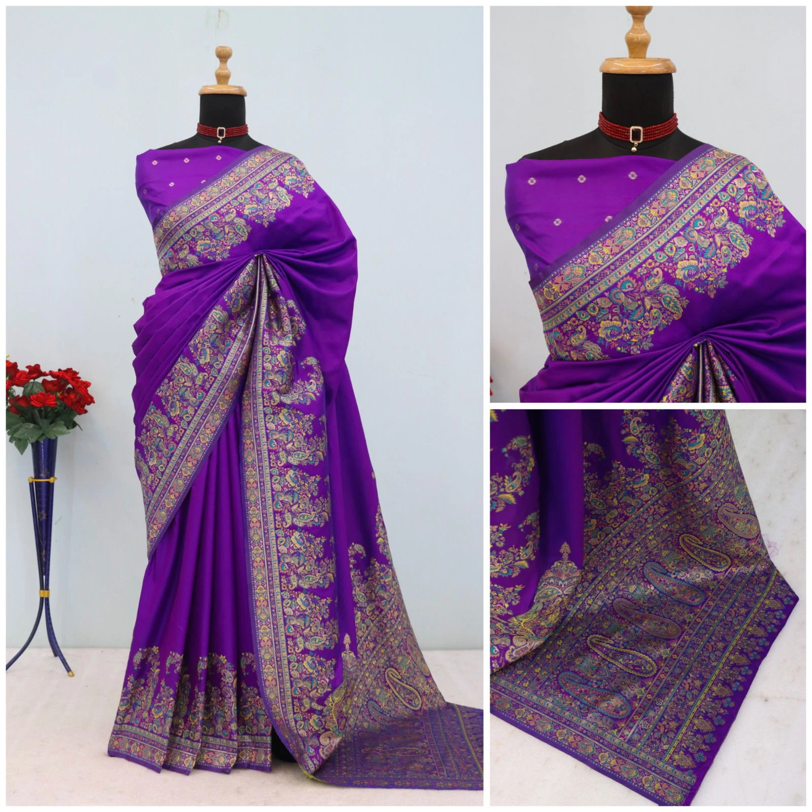 | Saree | Pashmina Silk with Multi Color Paisley Border and Contrasting Pallu with Woven Motifs |