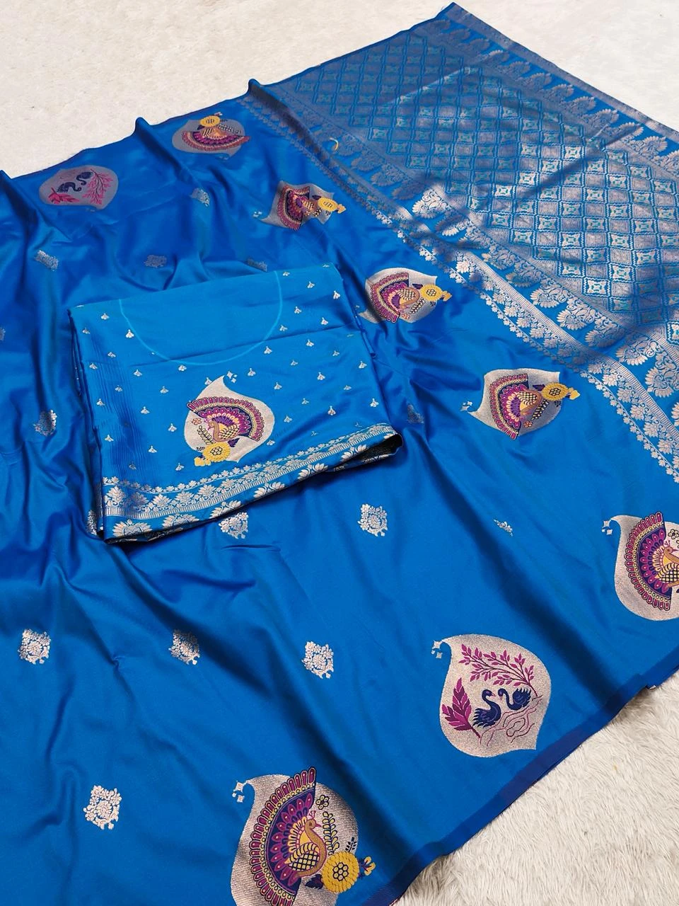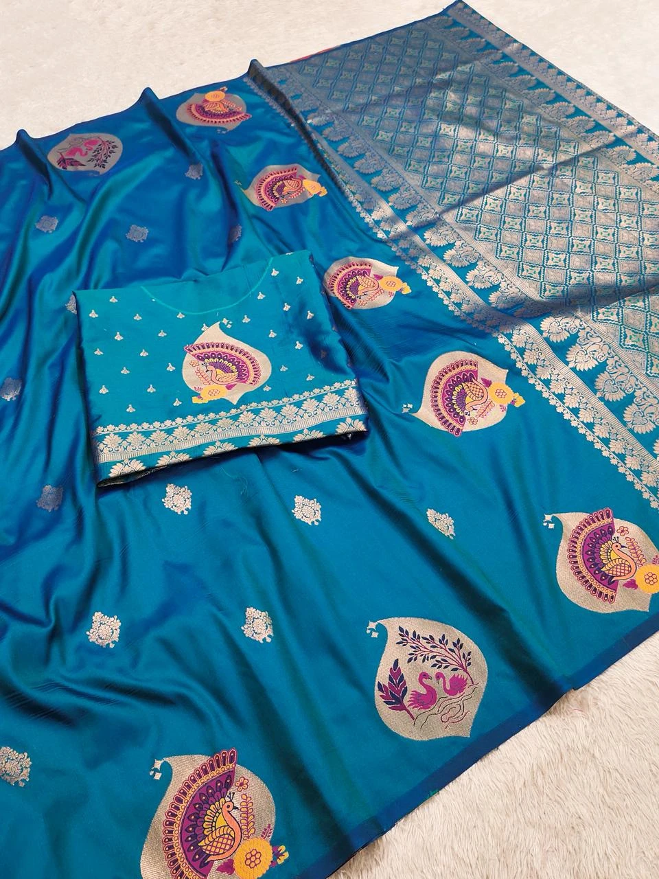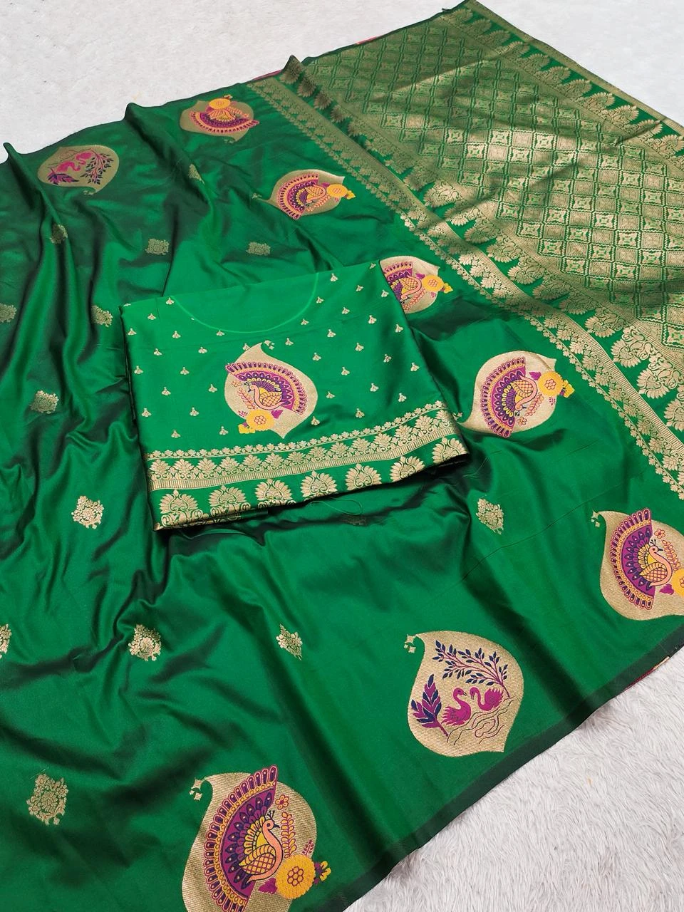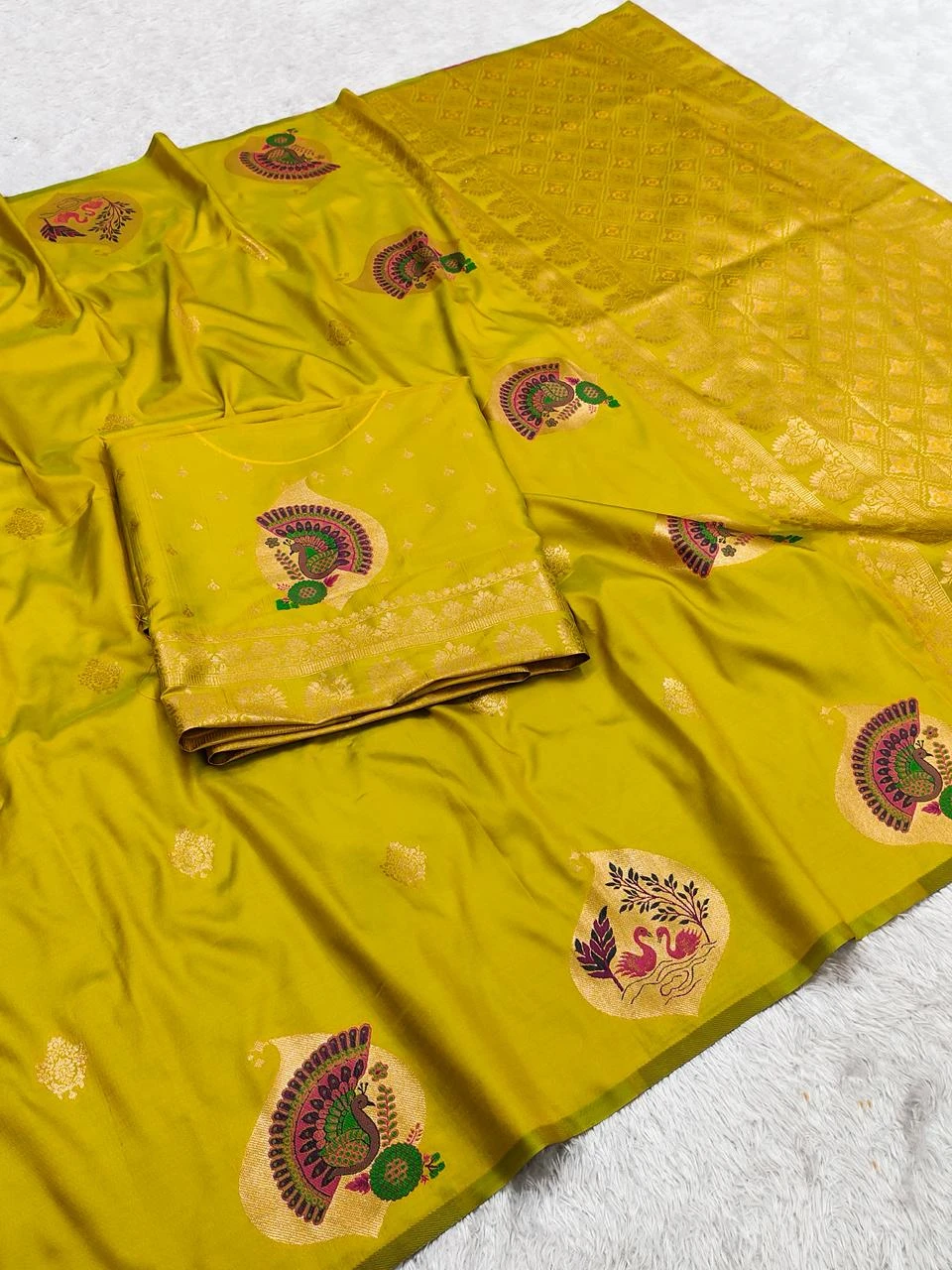 | Saree | Premium Banarasi Silk with All-over Small Zari Butta Weaving & Highlighted with Peacock & Swan Motifs Woven in Golden Zari with Multicolored Meenakari Accents and Heavy Zari Woven Pallu |