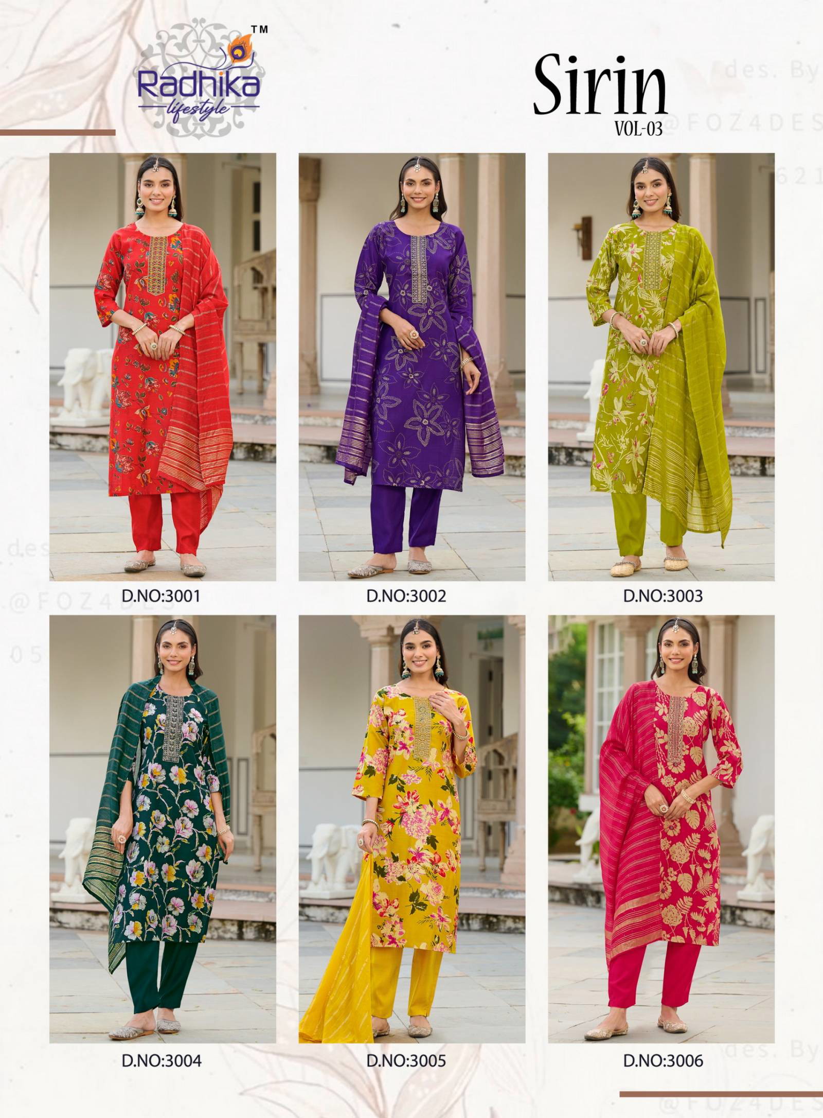 Radhika Sirin Vol 3 Vertican Foil Print Embroidery Wholesale Kurti Pant Dupatta Collection