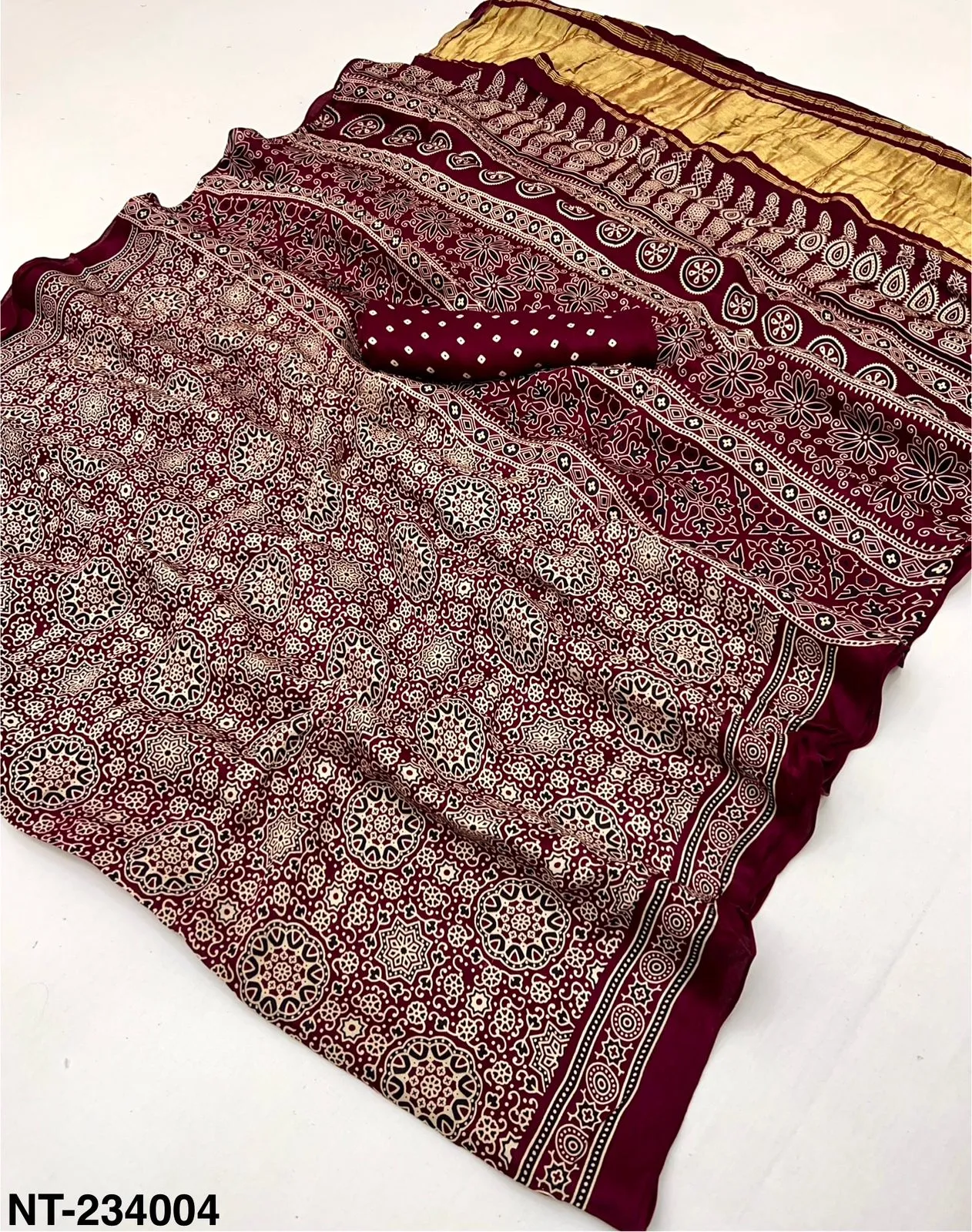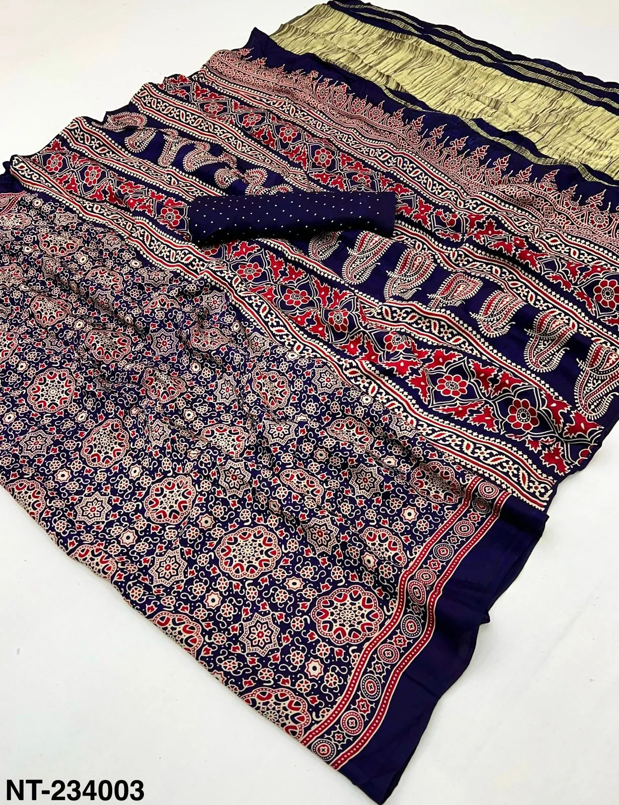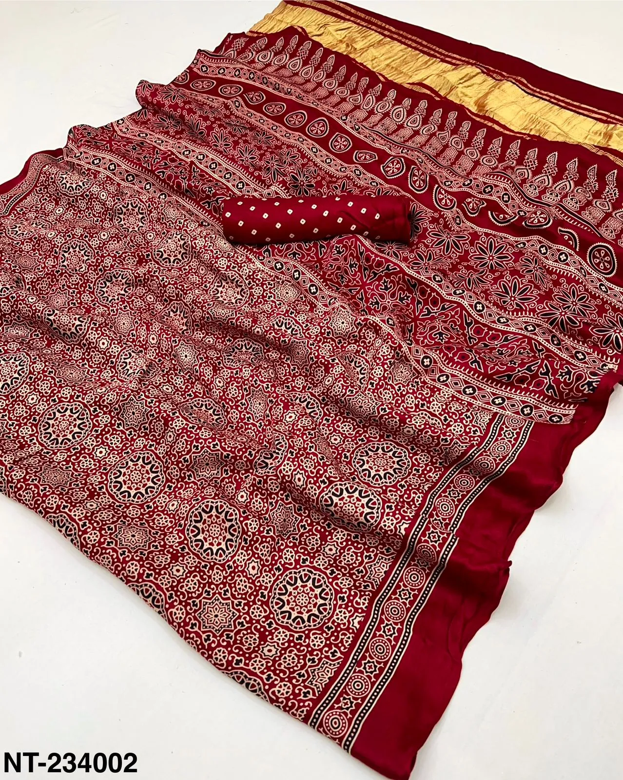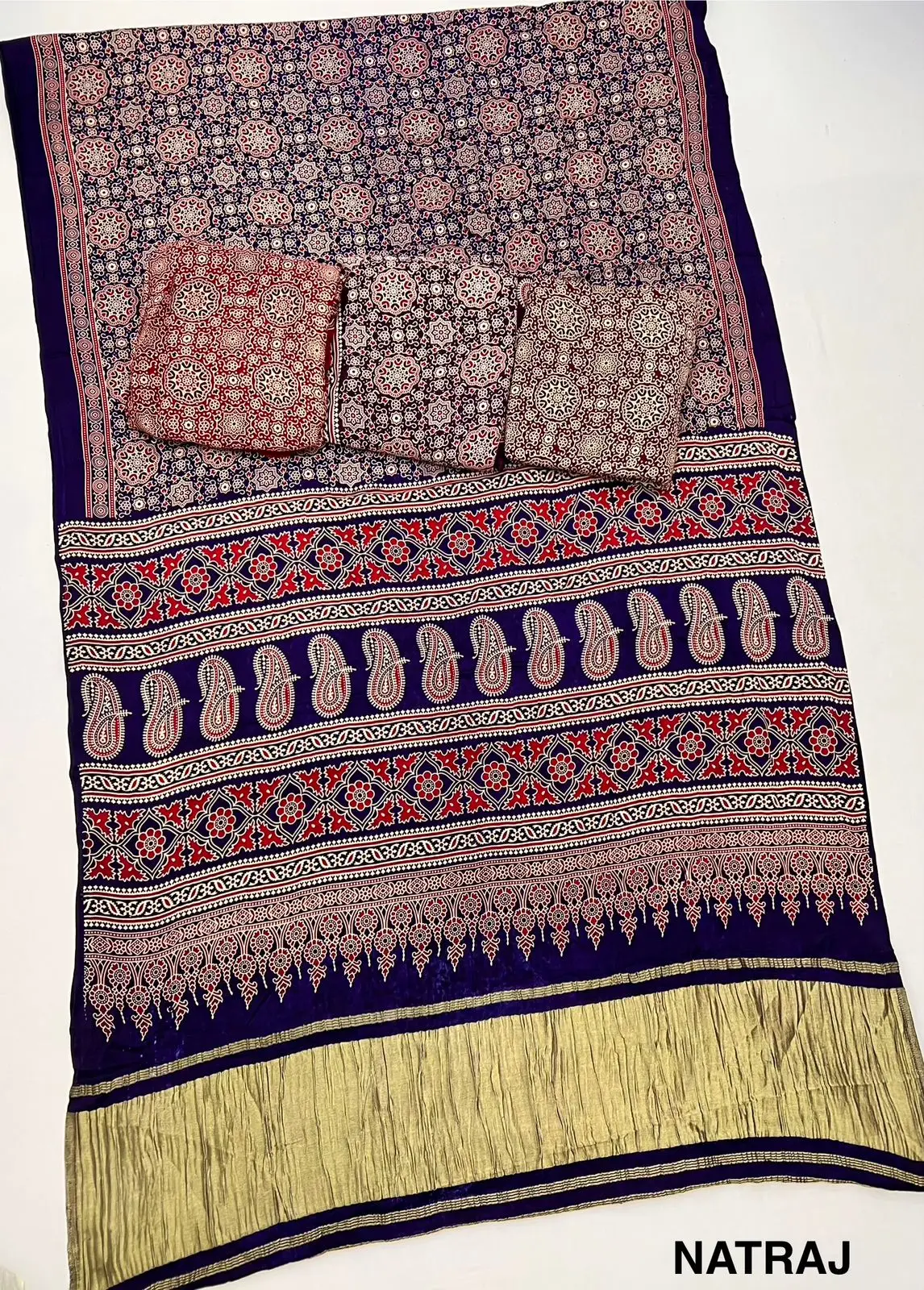 | Fabric | Pure Modal Ajrakh with Lagadi Patta & Handblock Print |