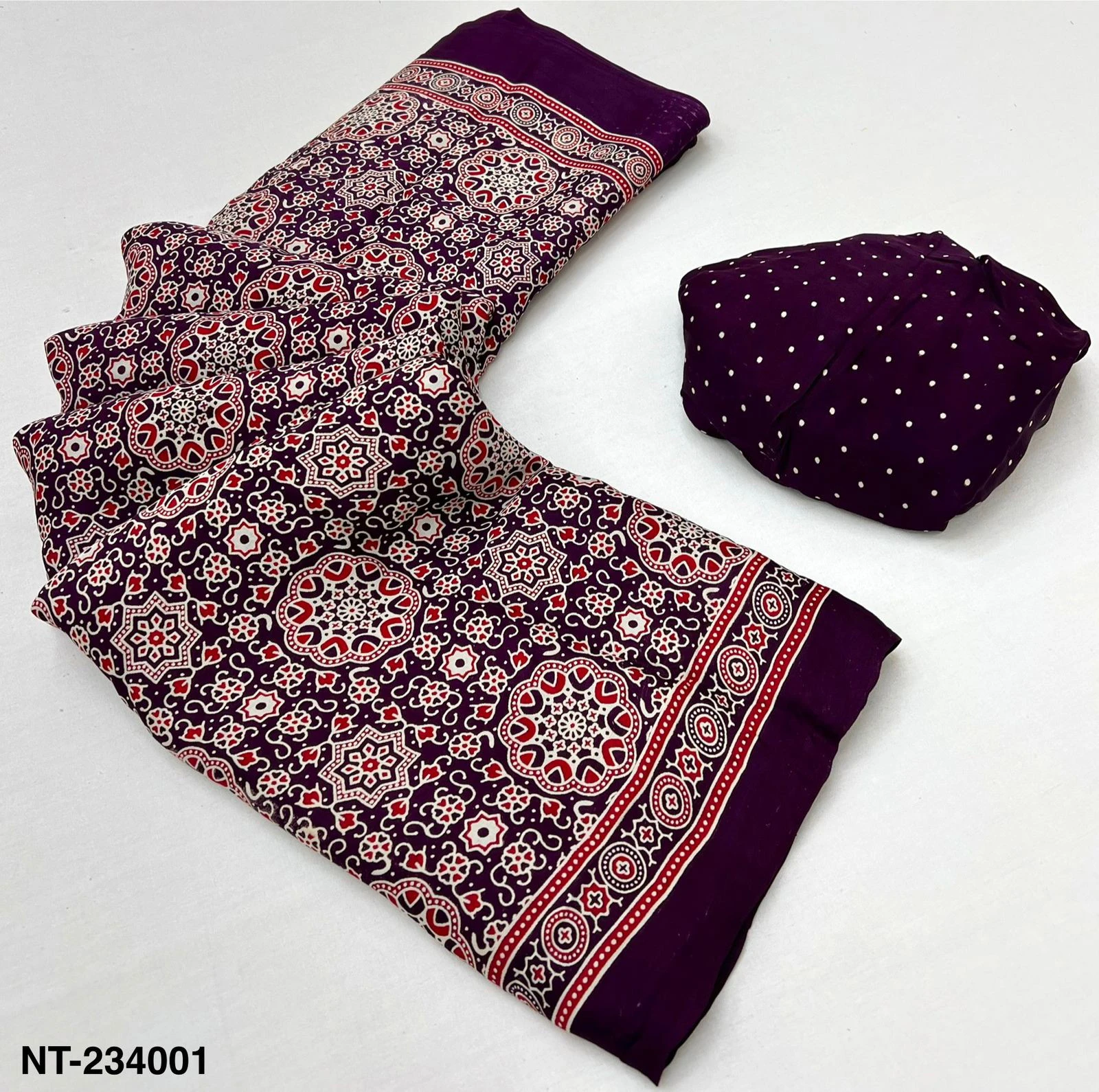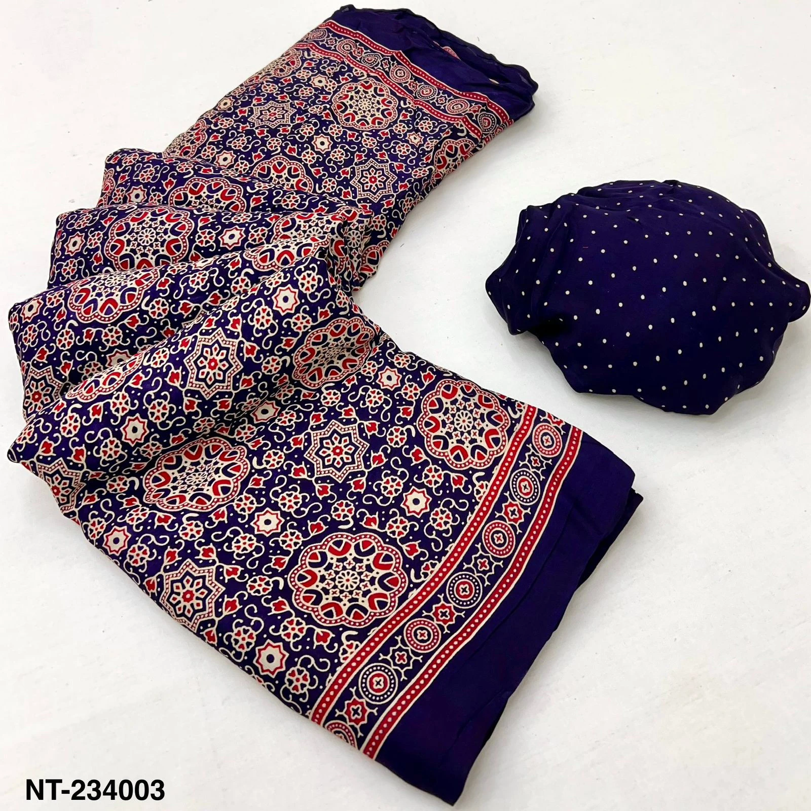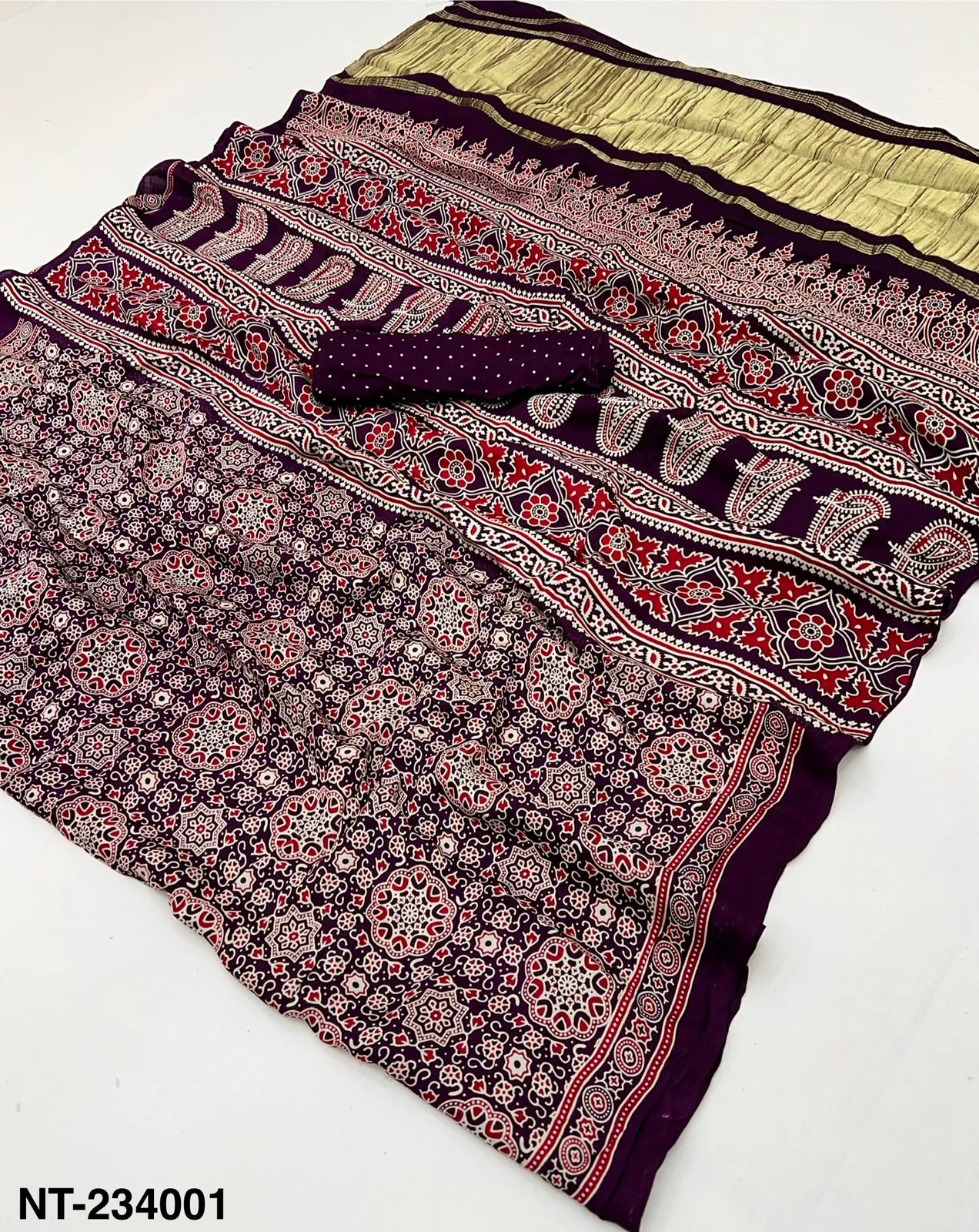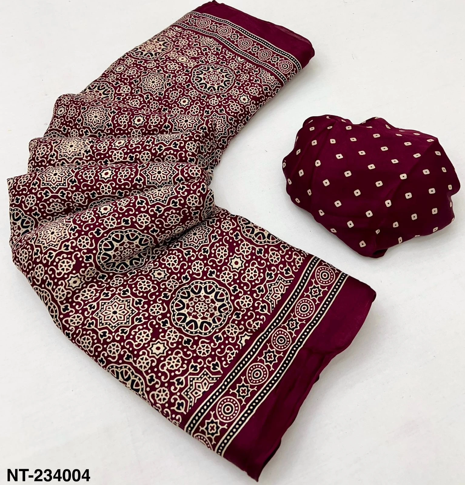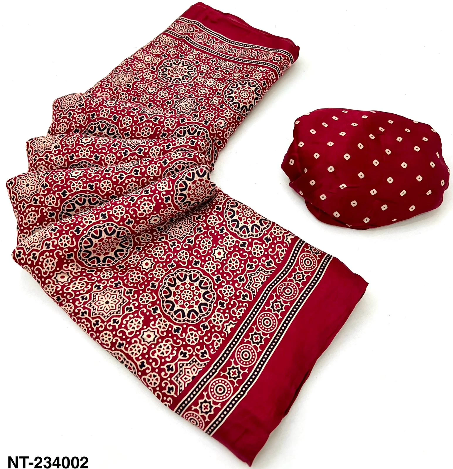 | Fabric | Pure Modal Ajrakh with Lagadi Patta & Handblock Print |