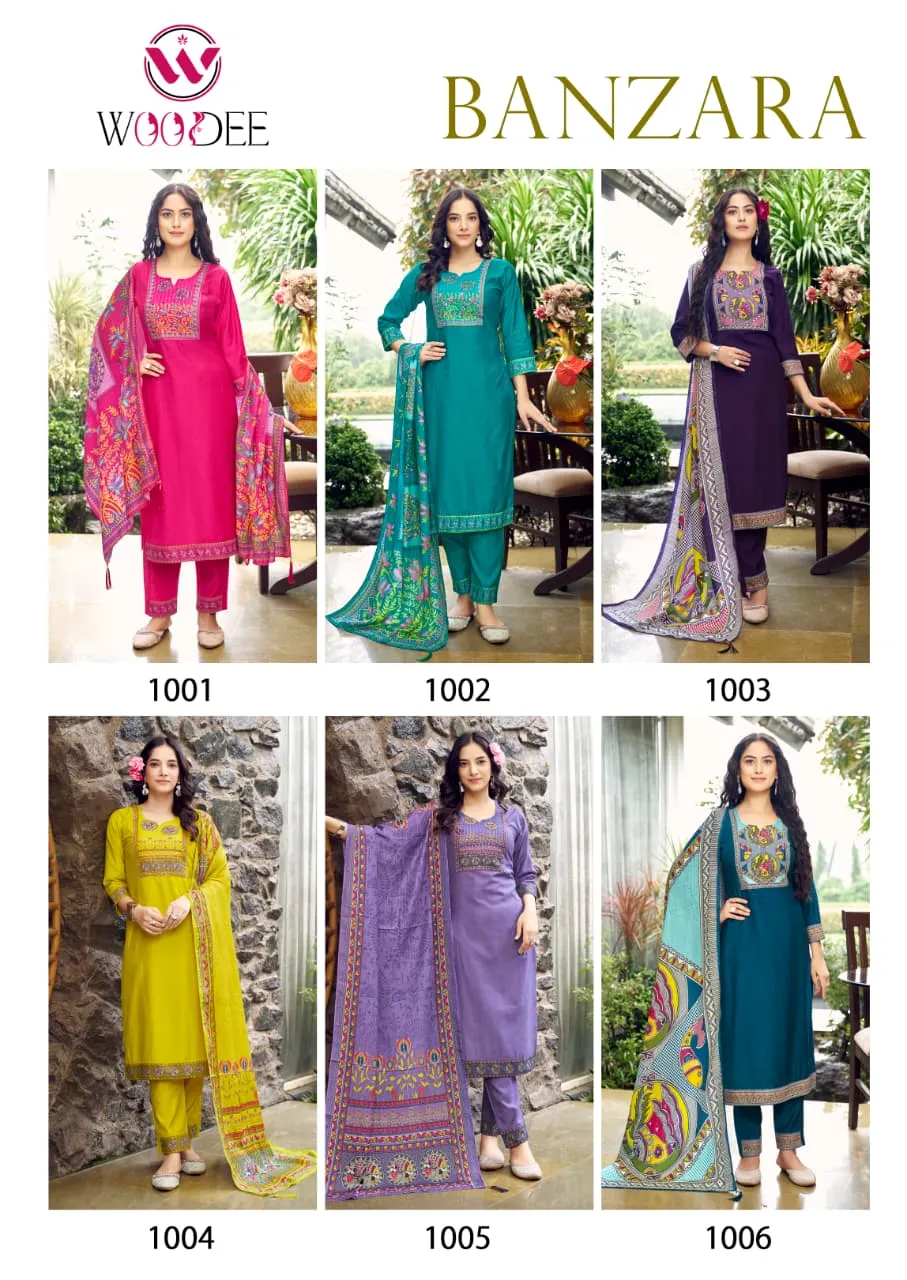 Woodee Banzara Viscose Vatican Thread Work Wholesale Kurti Pant and Dupatta Collection